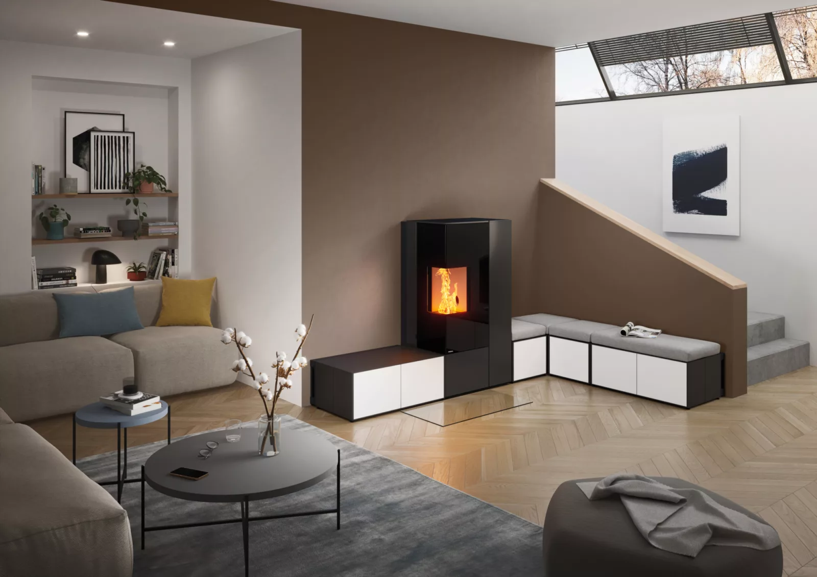 pellets modulaires. La vue en angle - à gauche ou à droite au choix - ouvre non seulement une vue exceptionnellement généreuse sur le feu, mais aussi de toutes nouvelles dimensions pour l'aménagement intérieur. Que ce soit